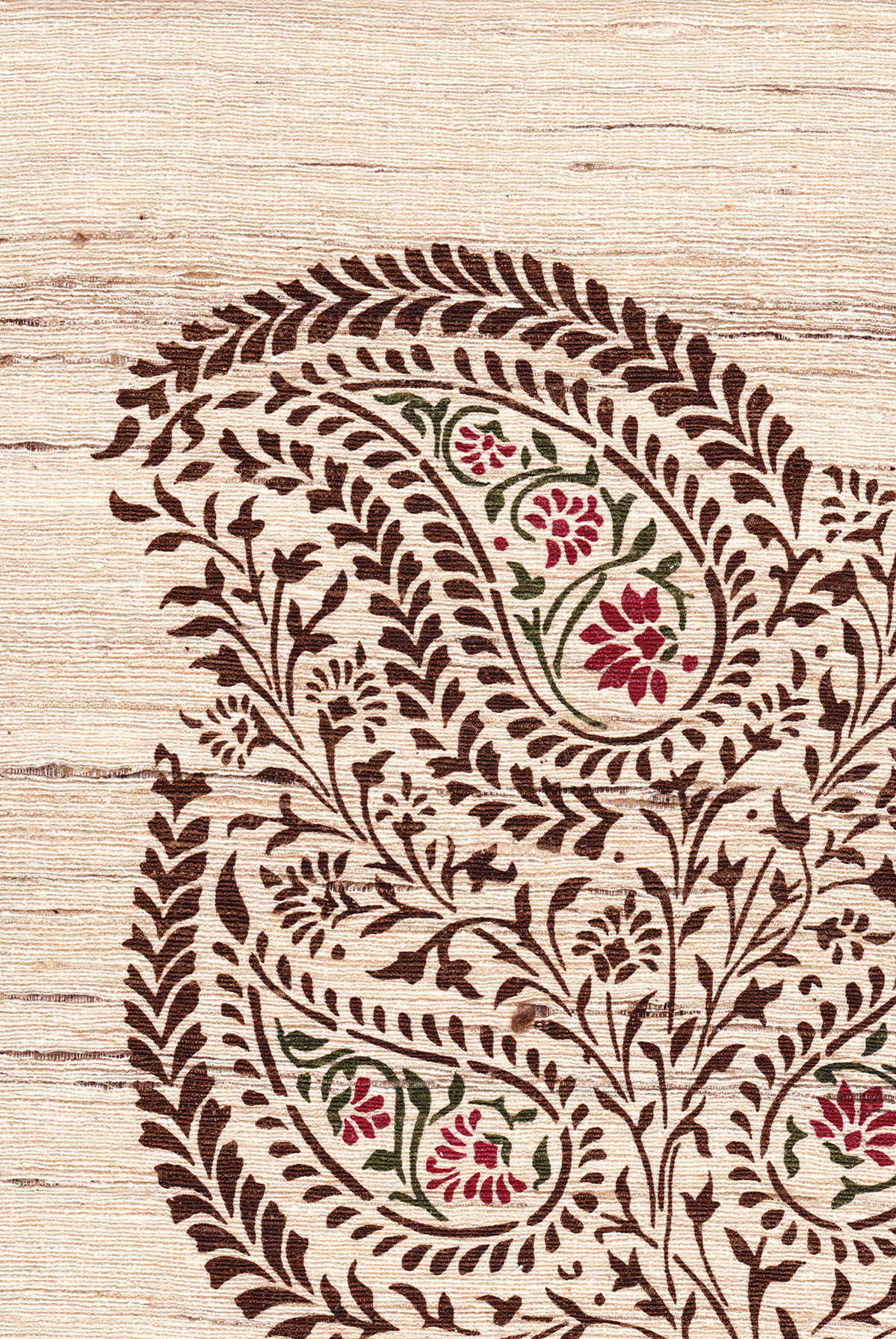 Our largest scale paisley design originated in either Benares, Kashmir or the Punjab, but this exotic, spiritual design embodies this rich culture beautifully. This large and lacy handcut stencil was turned into a three color screen to be handprinted in several colorways and can be custom hand printed as well.