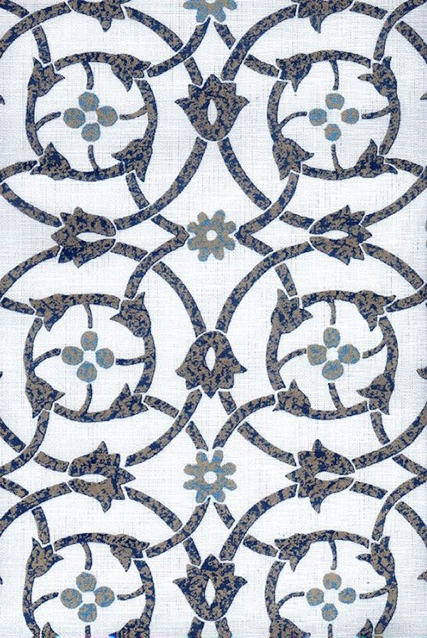Named for one of the outposts in the region of the fabled Silk Road, this Central Asian design uses the motif of interlocking roundels punctuated with stylized flowers and buds. After cutting a stencil of the design by hand, it has been turned into a silkscreen and can be hand printed in three colors.