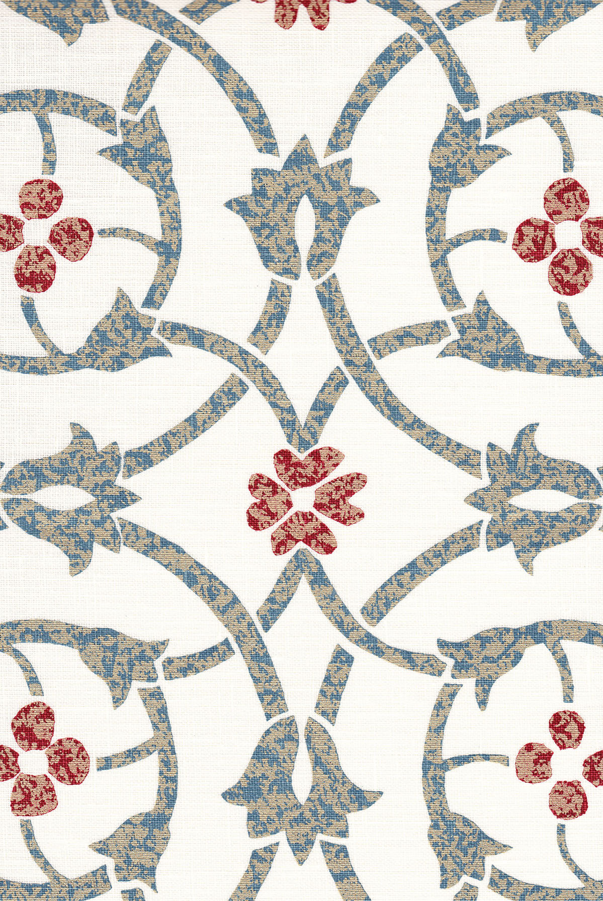 Named for one of the outposts in the region of the fabled Silk Road, this Central Asian design uses the motif of interlocking roundels punctuated with stylized flowers and buds. After cutting a stencil of the design by hand, it has been turned into a silkscreen and can be hand printed in three colors.
