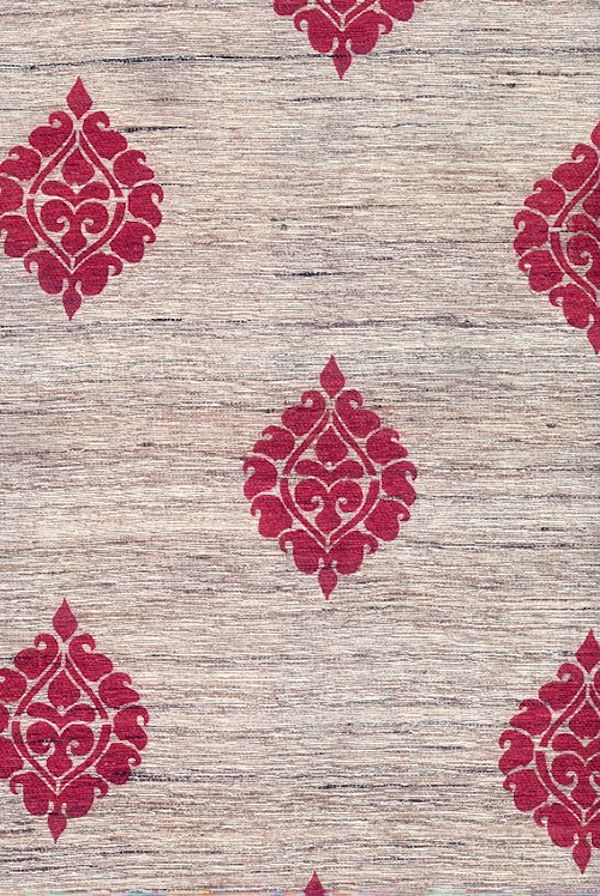 Though this design takes it's name from a city on India's southwestern coast, geographically it cannot be placed. It could possibly be from eastern Iran or possibly from the former Jin territories of Central Asia. It was an all over pattern when we discovered it and isolated a single medallion. After we hand cut a stencil of the design, we made a screen and double printed it with two colors to achieve the cast shadow that gives Malabar it's beautiful depth.