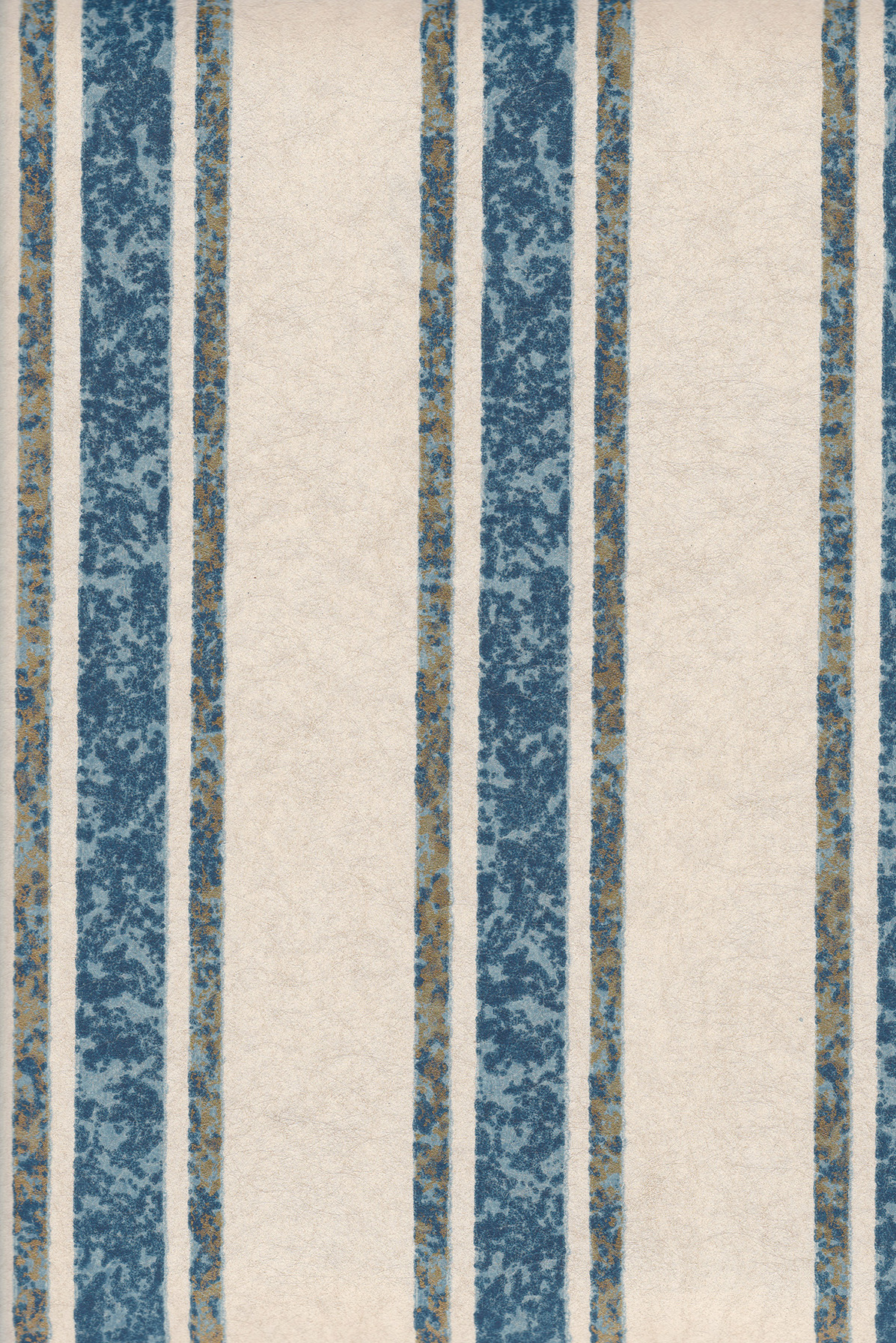 This unusual stripe was designed for a custom hand printed and hand stenciled project. The textured stippling of the strip allowed it to be joined at the repeat without being visible. The thin stripes on either side of the wider stripe were hand stenciled in gold for the original project. It can now be hand printed in any three colors besides the stock colorways.