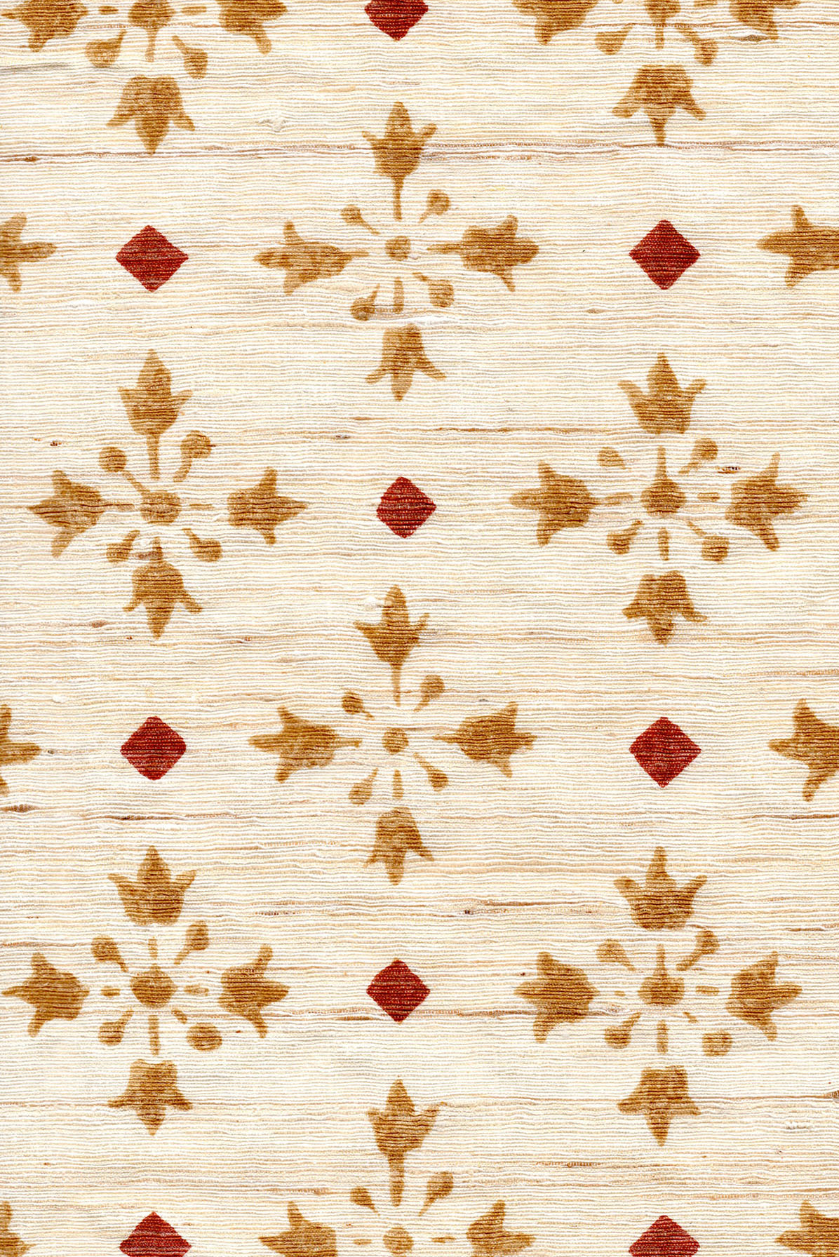 We took the name for this design from the Italian word for snowflake, which is what this delicate design motif reminded us of when we first saw it. It is actually but one element in a Belgian surface decoration from the Renaissance. We cut a stencil of it by hand and then created a silkscreen in three colors.