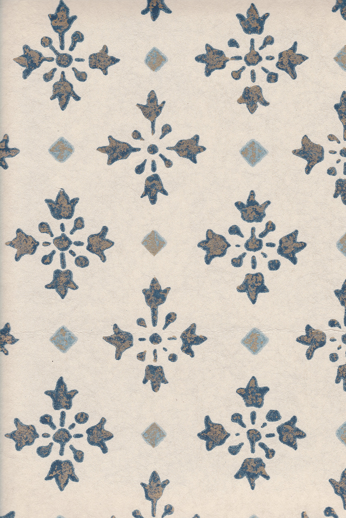 We took the name for this design from the Italian word for snowflake, which is what this delicate design motif reminded us of when we first saw it. It is actually but one element in a Belgian surface decoration from the Renaissance. We cut a stencil of it by hand and then created a silkscreen in three colors.