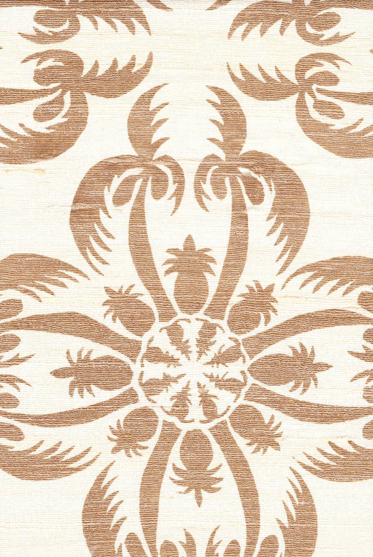 This design was inspired by a Polynesian textile depicting palm trees and coconuts. After we cut a stencil by hand for pillows for a home in Hawaii, we decided to turn it into a silkscreen for hand printed fabric and wallpaper.