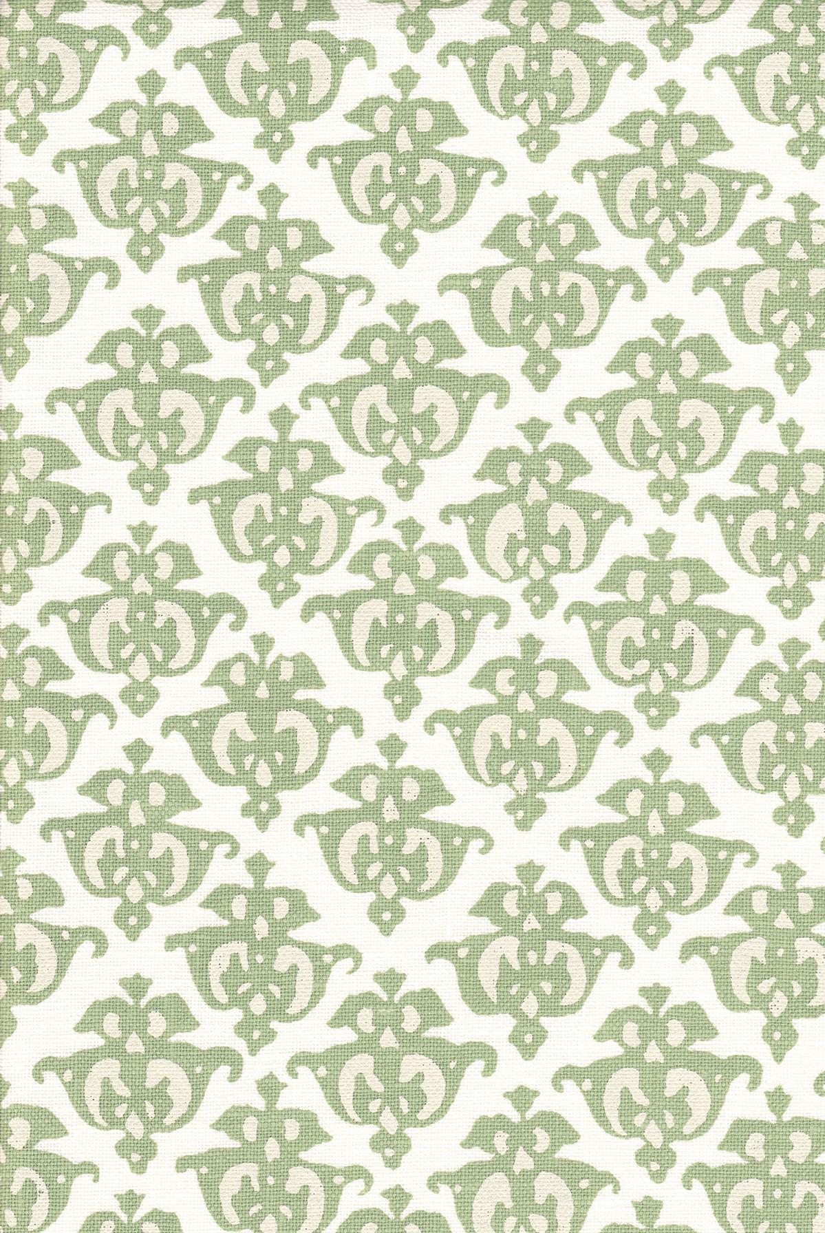 This unusual small scale print from the Italian Renaissance was derived from an English portrait of 1540. A top designer commissioned it for the chairs in a dining room filled with Impressionist paintings. The hand printed linen was then lightly sanded to give it a slightly distressed look, making it truly custom hand printed and sanded.