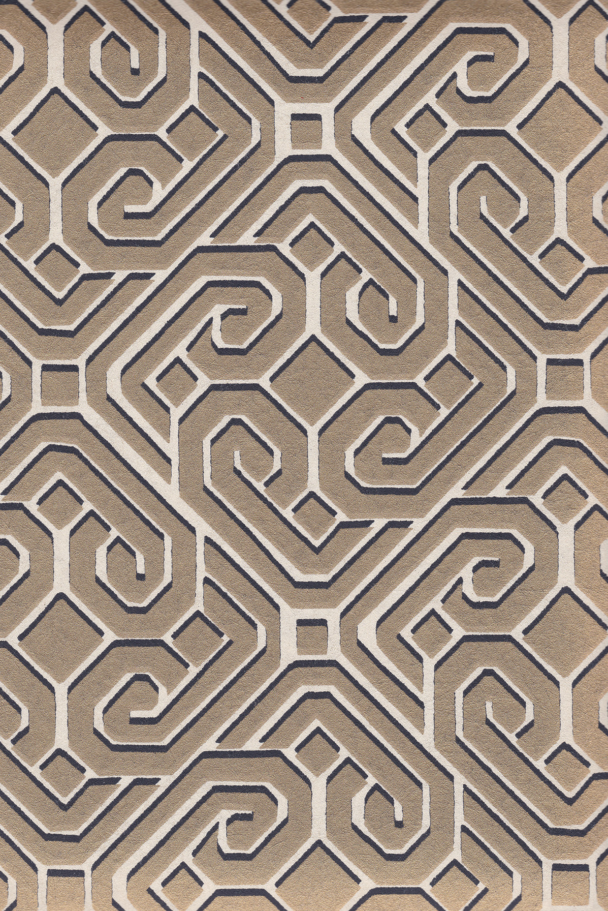 Tibet, one of our newest designs is inspired by an ancient Tibetan rug, which was "village made" by nomads for their own use, as opposed to the more sophisticated rugs made in the special workshops of Gyantse, Shigatse or Lhasa. We hand cut a stencil of the design and turned it into a screen for hand printing it onto hand woven silk, linen and wallpaper.