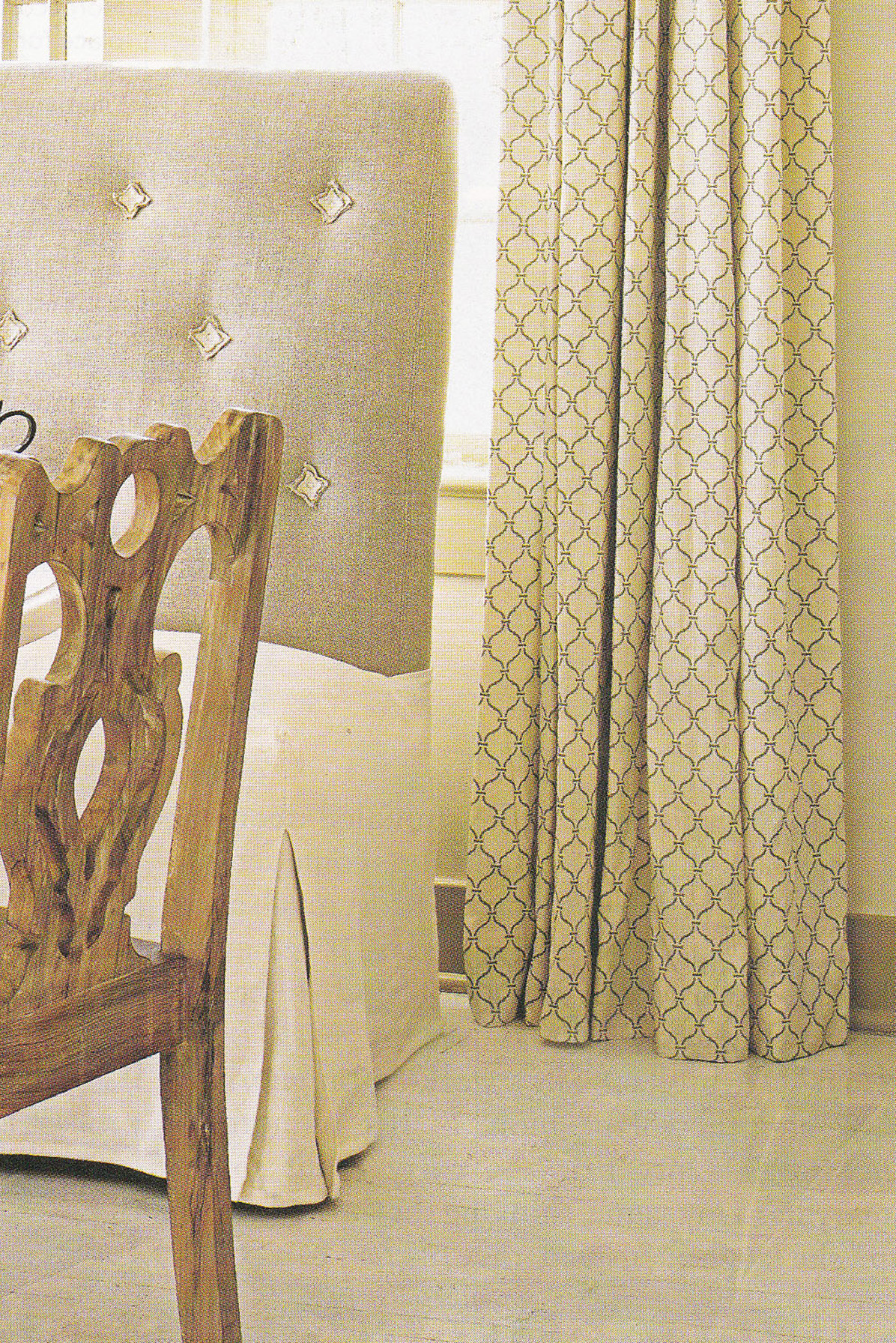 Like our other design, Monza, Valencia was a commissioned custom design that we hand cut stencils for, to be stenciled directly onto the walls of a bedroom. Years later we tried hand stenciling this design onto silk fabric and realized how beautiful it would be as hand printed fabric and wallpaper.